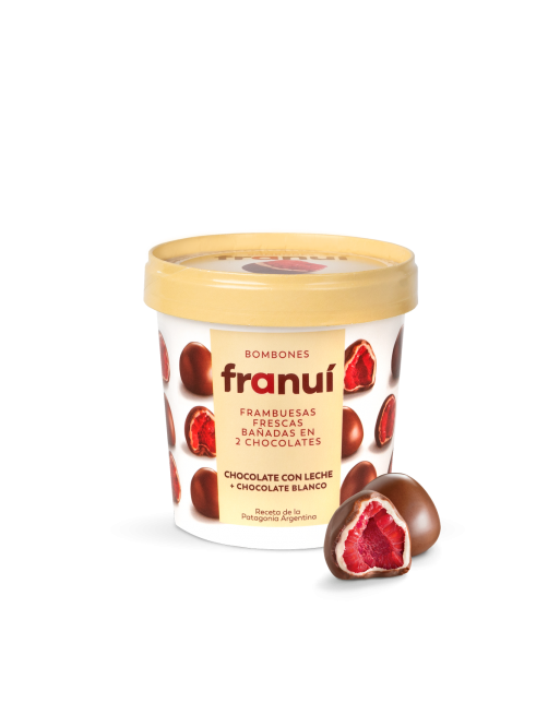 Las Franui son deliciosas frambuesas provenientes de la Patagonia, seleccionadas y clasificadas a mano, bañadas con delicioso chocolate. Para preservar el sabor no utilizamos conservantes, ni colorantes, ni esencias artificiales, sólo productos genuinos para garantizar su frescura y la mejor calidad. El contraste entre la frescura de la fruta y la cremosidad del doble baño de chocolate hacen que sea una combinación irresistible para cualquier paladar, sobre todo para aquellos que deseen experimentar algo único. Alimento libre de gluten.